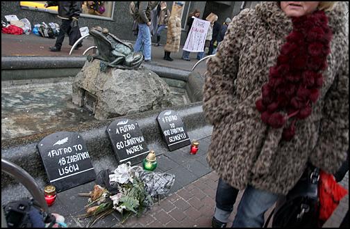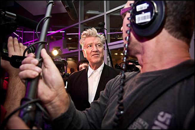 -- David Lynch osaczony przez ekipę medialną w naszym katowickim Rondzie Sztuki i obok zdjęcie jakiegoś futerkowego zwierzaka –analogie naszego osaczenia a zaraz obok zdj. mówiące nam ile, jakich zwierzątek trzeba zabić, aby włożyć na siebie jedno futro.
