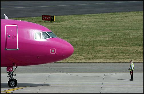 -- mały ptaszek (sikorka może coś innego?) i barwny dziób wielkiego samolotu. Właśnie ta barwa na szarości i dziwny różowy nos samoloty to przecież luźne i zabawne a zarazem zwracające uwagę zdjęcia.