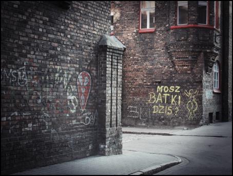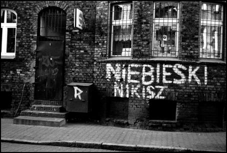 Magdalena Rejek z Chorzowa wybrała się do Nikiszowca. Jej wyprawa przyniosła zdjęcia tego Nikiszowca który może być niebieski a jest czerwony jak cegła z której został zbudowany. Dla młodych fotografów ważne są napisy na murach, to ich forma głoszenia swoich racji.(czy nam się to podoba czy nie fakt musimy zauważyć). Wydaje mi się że fotografując ten napis Magdalena stanęła po stronie tych którzy chcieliby niebieskiego Nikiszowca. Fantazja to siła napędowa sztuki na każdym jej poziomie.