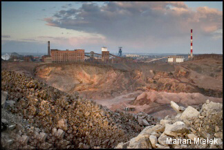 Hałdy do tej pory były pokazywane jako czarne zwałowiska kamienia i miału wydobytego z wnętrza ziemi. Marian pokazuje nam w barwach te kamienne odpady. Jesteśmy nawet zauroczeni tą kolorową mozaiką różnorodnych kamiennych pierwiastków. Żółć – ciepły brąz i święcące się odblaskiem refleksy.