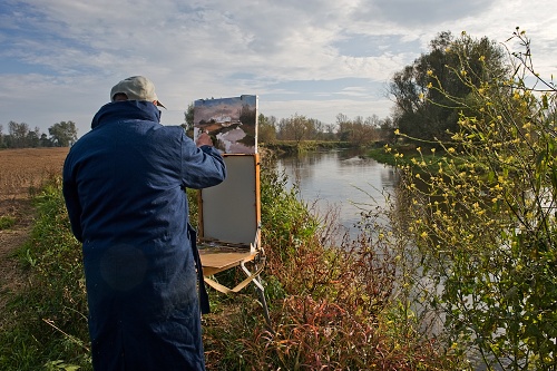 Artysta Plastyk Janusz Miszalski stawia swoją sztalugę w różnych miejscach różnie oświetlanych i bardzo dokładnie przygląda się temu wszystkiemu, co tworzy ten pejzaż.
