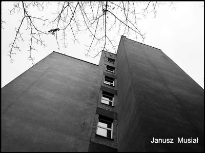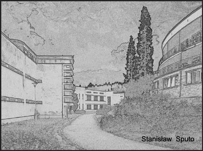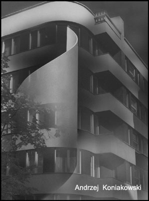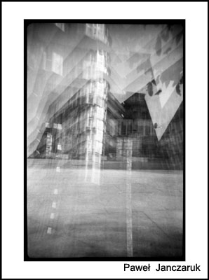 Stanisław Sputo jak przystało na emerytowanego już specjalistę elektryczności liniami ciągłymi połączył wszystkie modernistyczne budynki nie wyłączając z tej gmatwaniny tak drzew jak i chmur. Ten linearny wizerunek to świat logicznie połączonych obiektów. Paweł Janczaruk nasz kolega z Zielonej Góry przyjechał i swoja otworkową kamerą zarejestrował to, co ulotne a za razem zwielokrotnione gdy szybko oglądamy otaczającą nas rzeczywistość. Wrażenia się mam nakładają, zamazują i zwielokrotniają. Przecież w takim chaosie żyjemy!