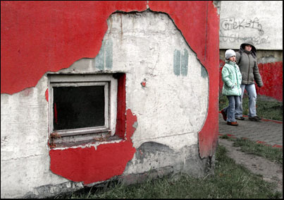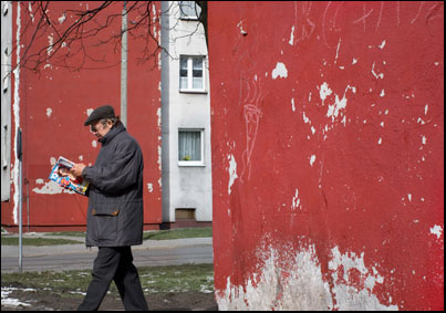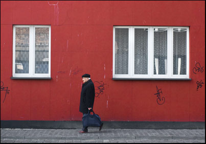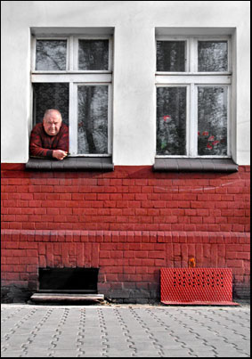 Stary człowiek patrzący przez okno to to, co było tak charakterystyczne dla tych śląskich ulic jest tym kolejnym łącznikiem tradycji z nowoczesnością. Nowe budownictwo już w jasnych kolorach wypiera stare i też pojawia się w tym zestawie jeszcze nieśmiało, ale znacząco. Stare chlewiki są przerabiane na garaże, ale kolor tych bram jest nadal ceglany. Nasze tramwaje są nadal czerwone, choć wypiera je wielobarwna reklama. Nawet wielkogabarytowy pojemnik na śmieci też w większości jest malowany minią o kolorze ceglanym bliskim czerwieni. Tynki nowych domów położone niedbale odpadają tworząc często czerwono białe plamy.