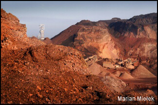 Hałdy do tej pory były pokazywane jako czarne zwałowiska kamienia i miału wydobytego z wnętrza ziemi. Marian pokazuje nam w barwach te kamienne odpady. Jesteśmy nawet zauroczeni tą kolorową mozaiką różnorodnych kamiennych pierwiastków. Żółć – ciepły brąz i święcące się odblaskiem refleksy.