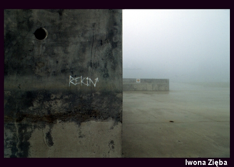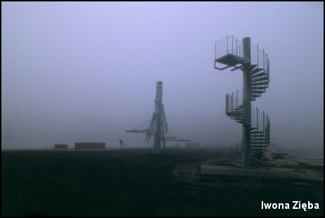 Iwona Zięba sięga po przedziwne konstrukcje wyłaniające się z mgielnego niebytu, które na pierwszy rzut oka przypomina konstrukcje kopalnianych wież.( w sztuce to jest dobre, gdy każdy może zobaczyć właśnie to, co chce).