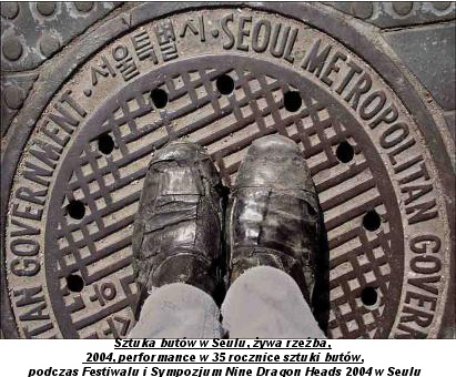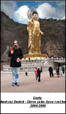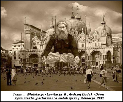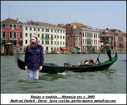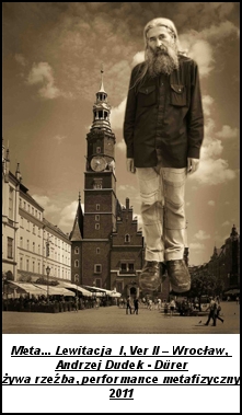 Andrzej Dudek-Dürer o fotografiach z „Wystawy „Meta Przemiana II, Andrzej Dudek-Dürer, Żywa Rzeźba”: od 1969 realizuję life performance Sztuka Butów – Sztuka Spodni – Sztuka Andrzeja Dudka-Dürera / żywa rzeźba / w Miejscach, w których się Pojawiam... Buty i spodnie są używane od 43 lat. Podawane są one regularnej naprawie oraz różnego rodzaju formom dokumentacji – fotografia, obiekty, video, grafika, rysunek... Wchodzą one w stały kontakt z odbiorcą / często nieświadomego udziału w relacji artystycznej (...) Sztuka jest dla mnie sposobem, możliwością, autorealizacji komunikacji i kooperacji... Moje Życie jest Sztuką (...)
