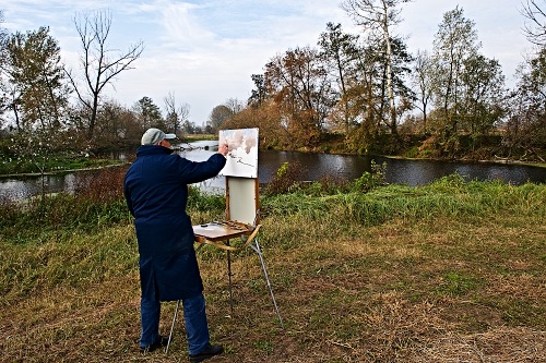 Artysta Plastyk Janusz Miszalski stawia swoją sztalugę w różnych miejscach różnie oświetlanych i bardzo dokładnie przygląda się temu wszystkiemu, co tworzy ten pejzaż.