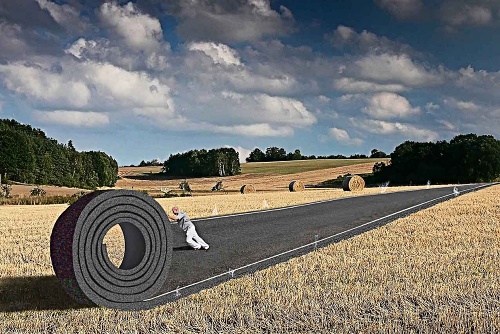 I tak jest z kolejnymi zestawieniami które będąc rózne jednak się uzupełniają i dodają nam bardzo osobistych skojarzeń! Dla mnie zdjęcie czarnego rulonu rozwijającego na żółtej ziemi dywan przypominający autostradę jest bardzo charakterystyczny i wierny naszej wiedzy o budowie autostrad polskich – a mały człowieczek popychajacy ten walec jest symbolem naszych możliwości organizacyjnych